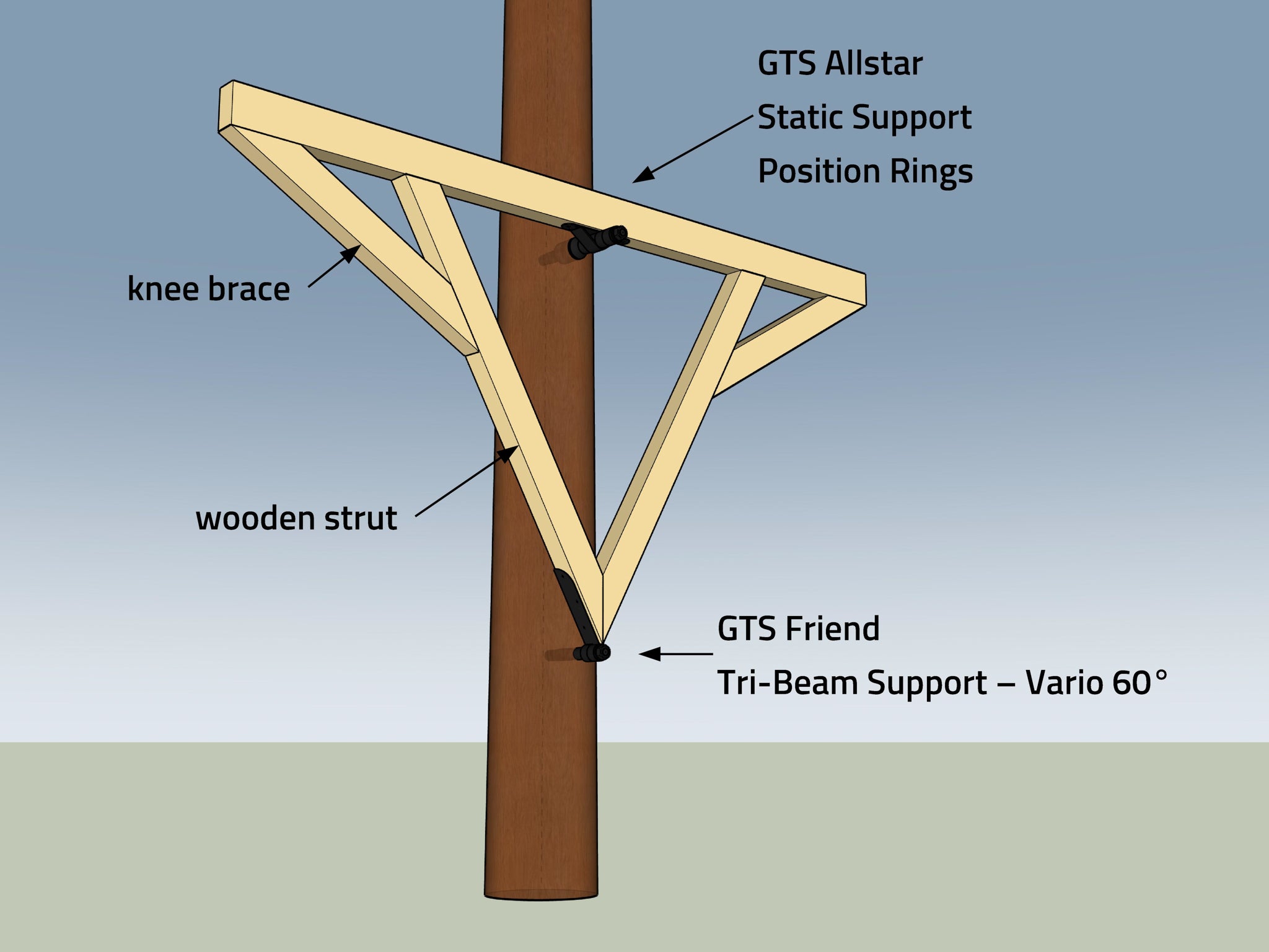 The variable angle from 60° pointed to 120° open opens up a wide range of new possibilities for designing your treehouse platform. For example, you can easily avoid thick branches or build asymmetrical, one-sided cantilevered platforms.