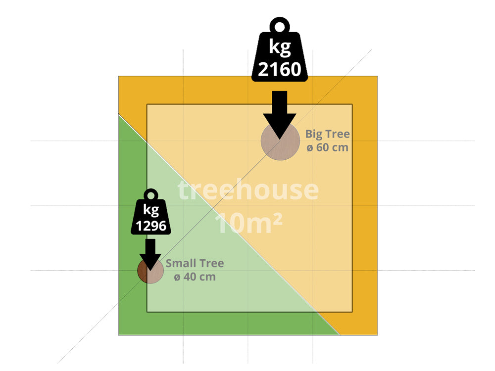 Trær kan bære enorme belastninger gjennom stammer og røtter – et trehus som veier flere tonn er ikke noe problem. Bæreevnen til de enkelte festepunktene er avgjørende.