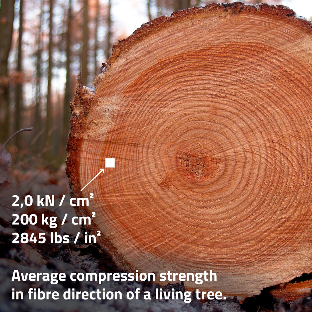 «Levende tre» har en gjennomsnittlig trykkfasthet langs treets retning på omtrent 2,0 kN/cm² eller 200 kg/cm² , med avvik på opptil omtrent 0,50 %; egenskaper ved ferskt tre . En rund, rett trestamme med en diameter på 30 cm kan teoretisk sett bære en last på 707 cm² × 200 kg = 141 tonn. I følge konstruksjonsteknikk (beregning for eksempel i henhold til Eurocode C16 for utendørs bruk) kan en 3 meter lang trestolpe med et tverrsnitt på 30 x 30 cm fortsatt bære omtrent 7 tonn – med sikkerhetsfaktorer.