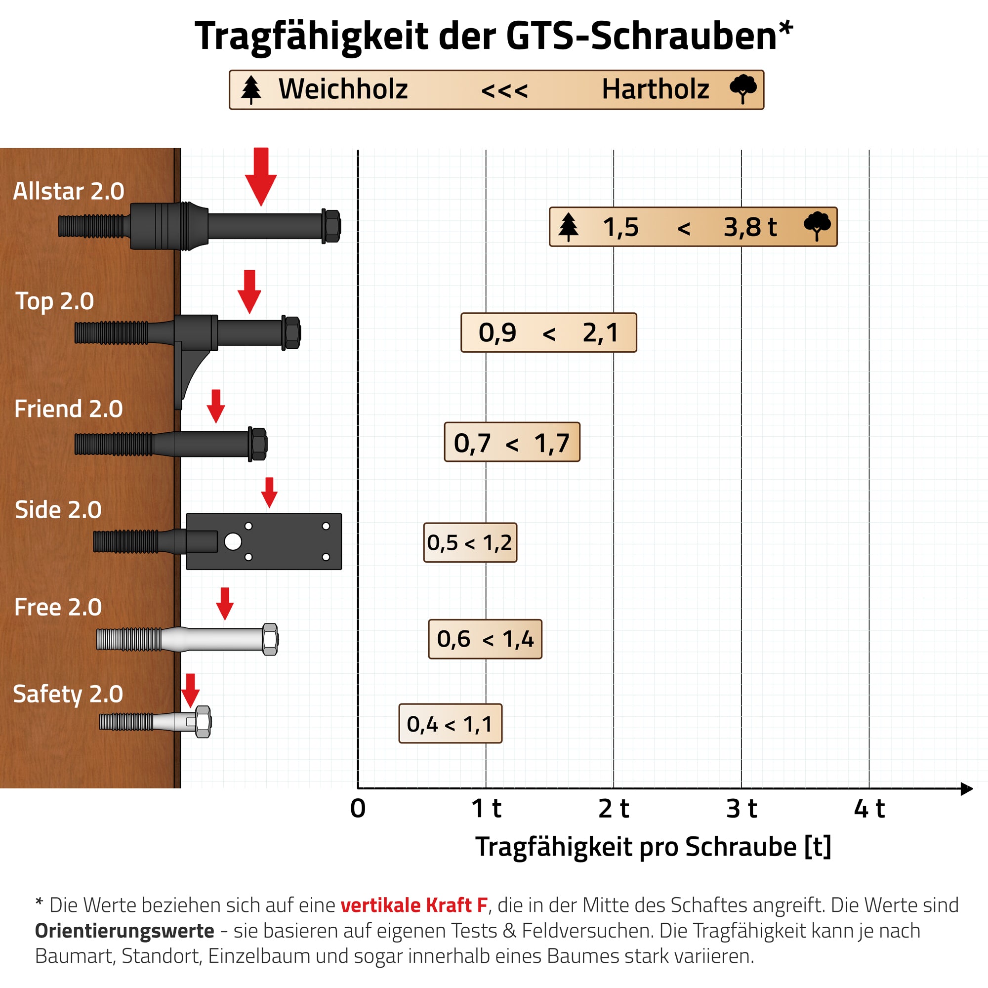 ✔ Select the right tree bolt depending on the trunk diameter, wood strength and load.