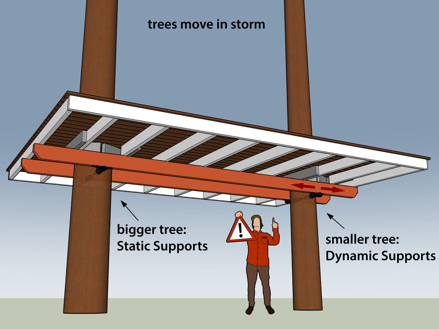 To avoid tension and damage to the support structure and the tree, trees that sway heavily must be decoupled.