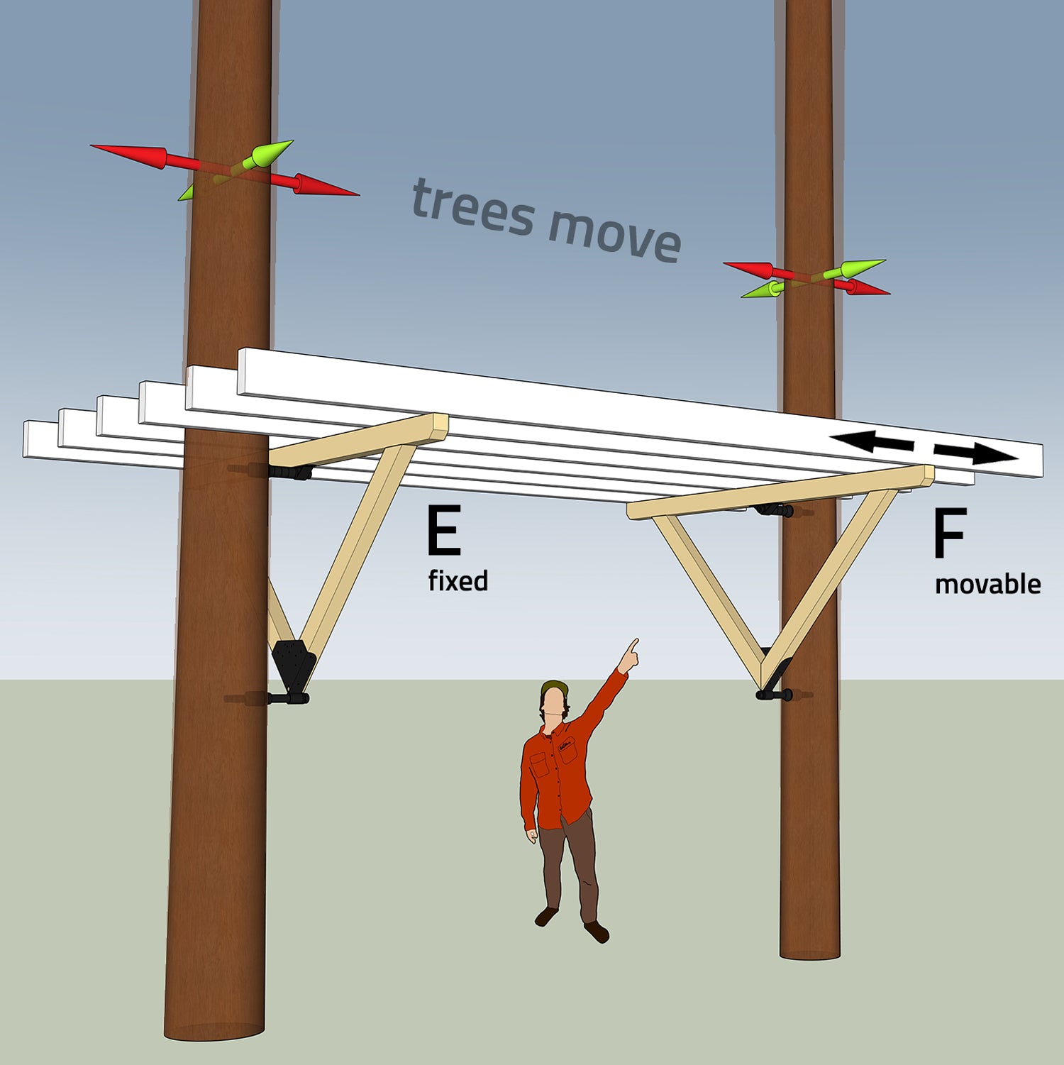 A support structure spanning several trees always requires a fixed point, otherwise the platform will slide around uncontrollably.