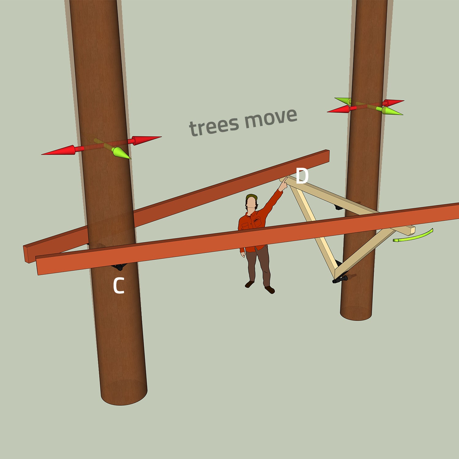 B: The struts would be too thin and too long for a heavy treehouse (?) – additional struts would have to be inserted to reduce the buckling length.