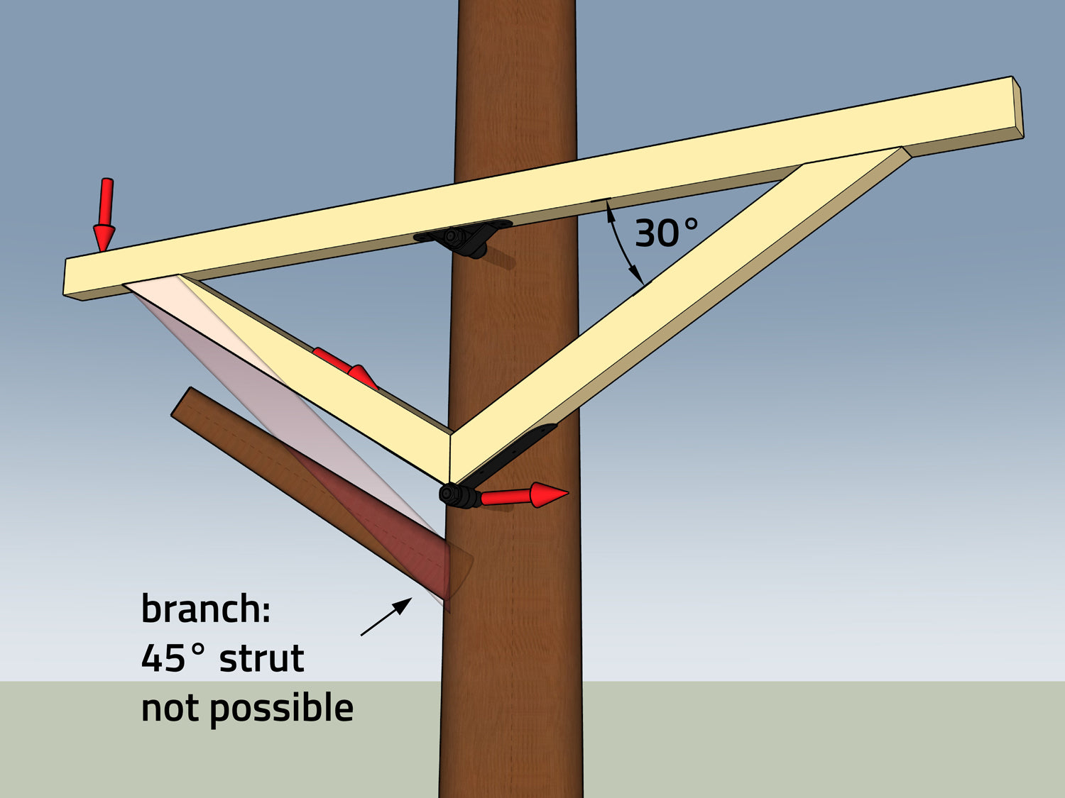 Los triángulos planos también pueden ser una solución elegante. Sin embargo, el ángulo del soporte inferior no debe ser demasiado plano (máx. 120°), ya que de lo contrario las fuerzas horizontales sobre el perno para casa del árbol serían demasiado grandes.