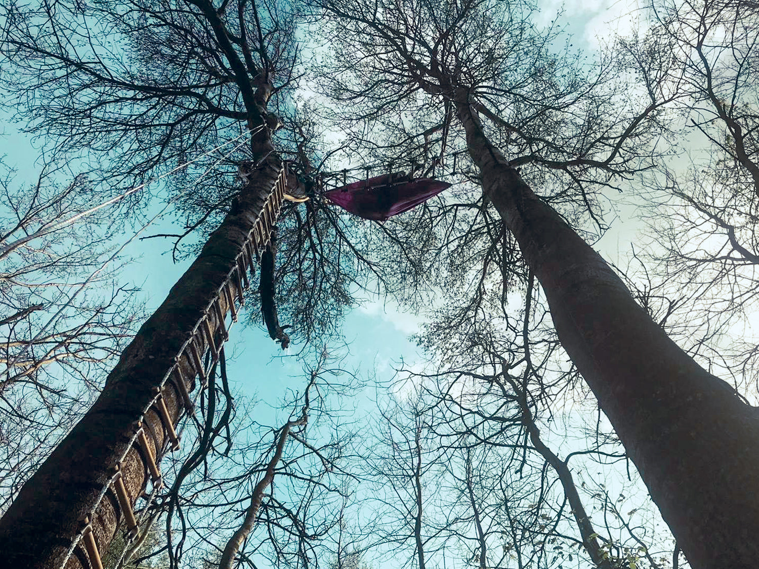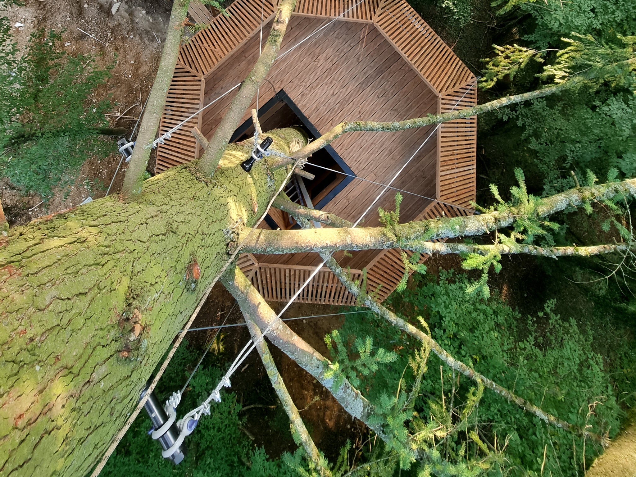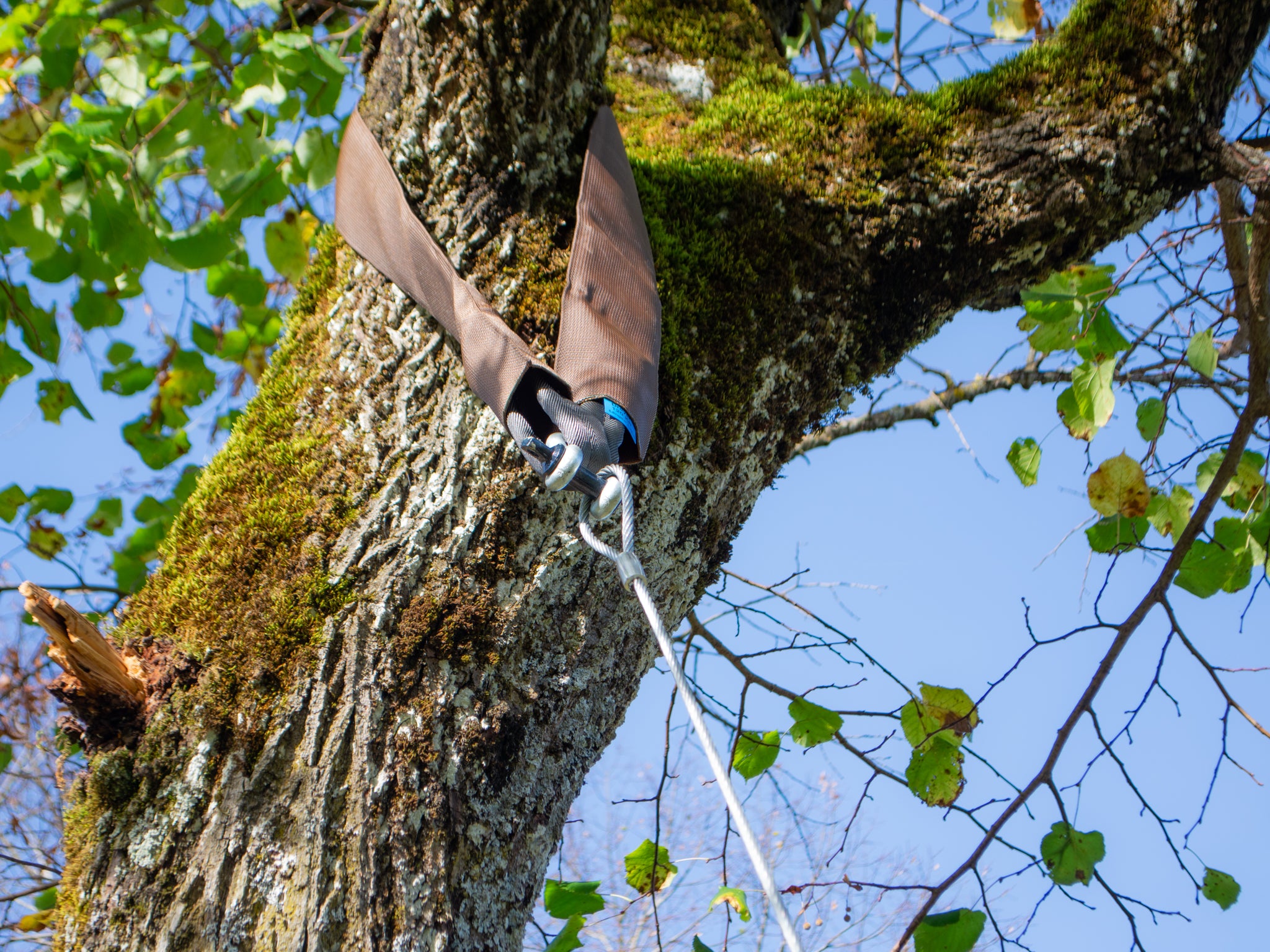 Les sangles de haubanage sont plus adaptées aux arbres à feuilles caduques avec des branches solides et fourchues. Les conifères, en revanche, n'offrent souvent aucun point d'ancrage naturel, c'est pourquoi il est préférable d'utiliser des boulons pour cabanes dans les arbres pour suspendre les cordes.