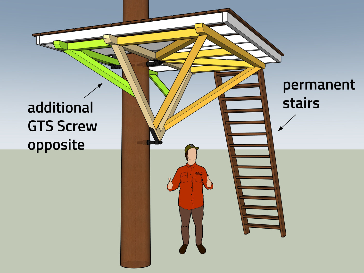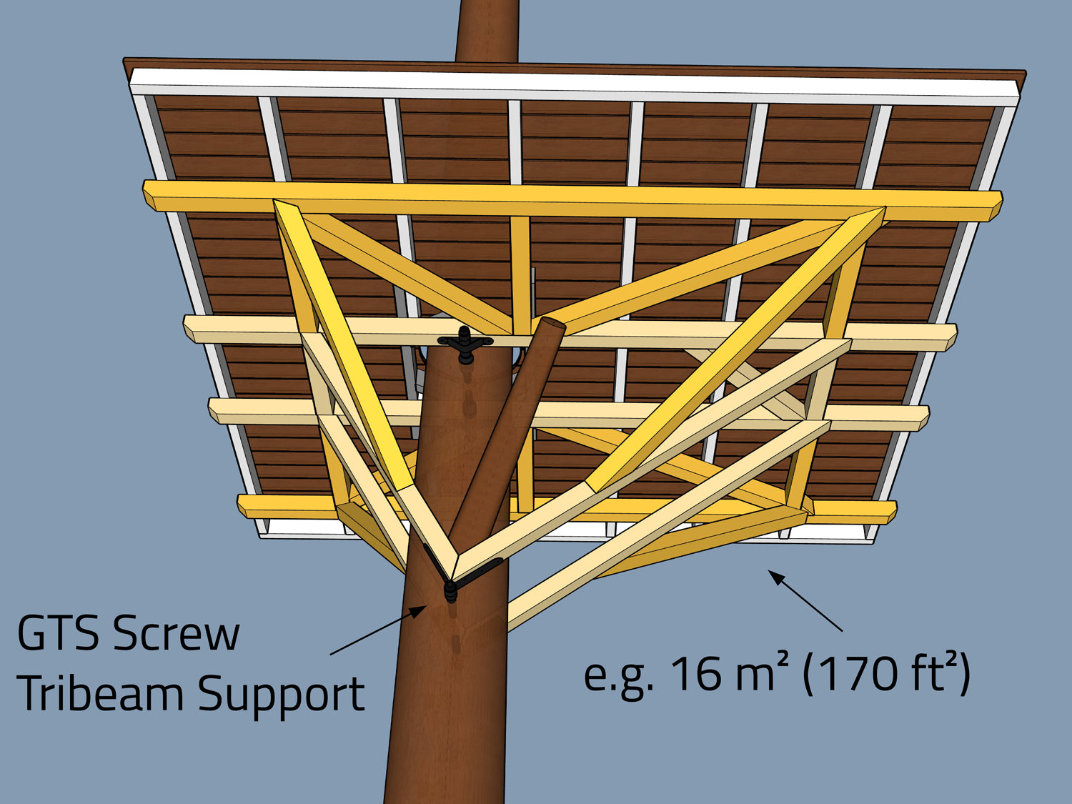 Mit 3D-Dreiecken lassen sich beliebig große Plattformen realisieren. Die Lasten werden über die zusätzlichen Streben gut verteilt und in die unteren GTS-Bolzen eingeleitet, wobei die Last den Bolzen in den Baum drückt und die Tragfähigkeit nochmals erhöht.