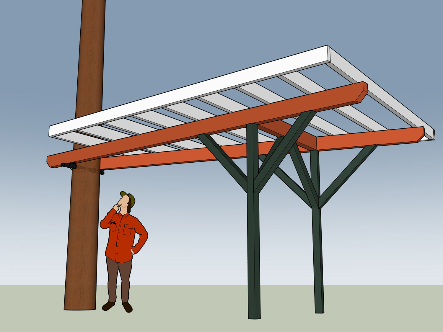 Du kannst auch zwei Längsbalken (rot) direkt am Baum befestigen. Zwar hast du ohne Dreieck mehr Platz unter dem Baum.