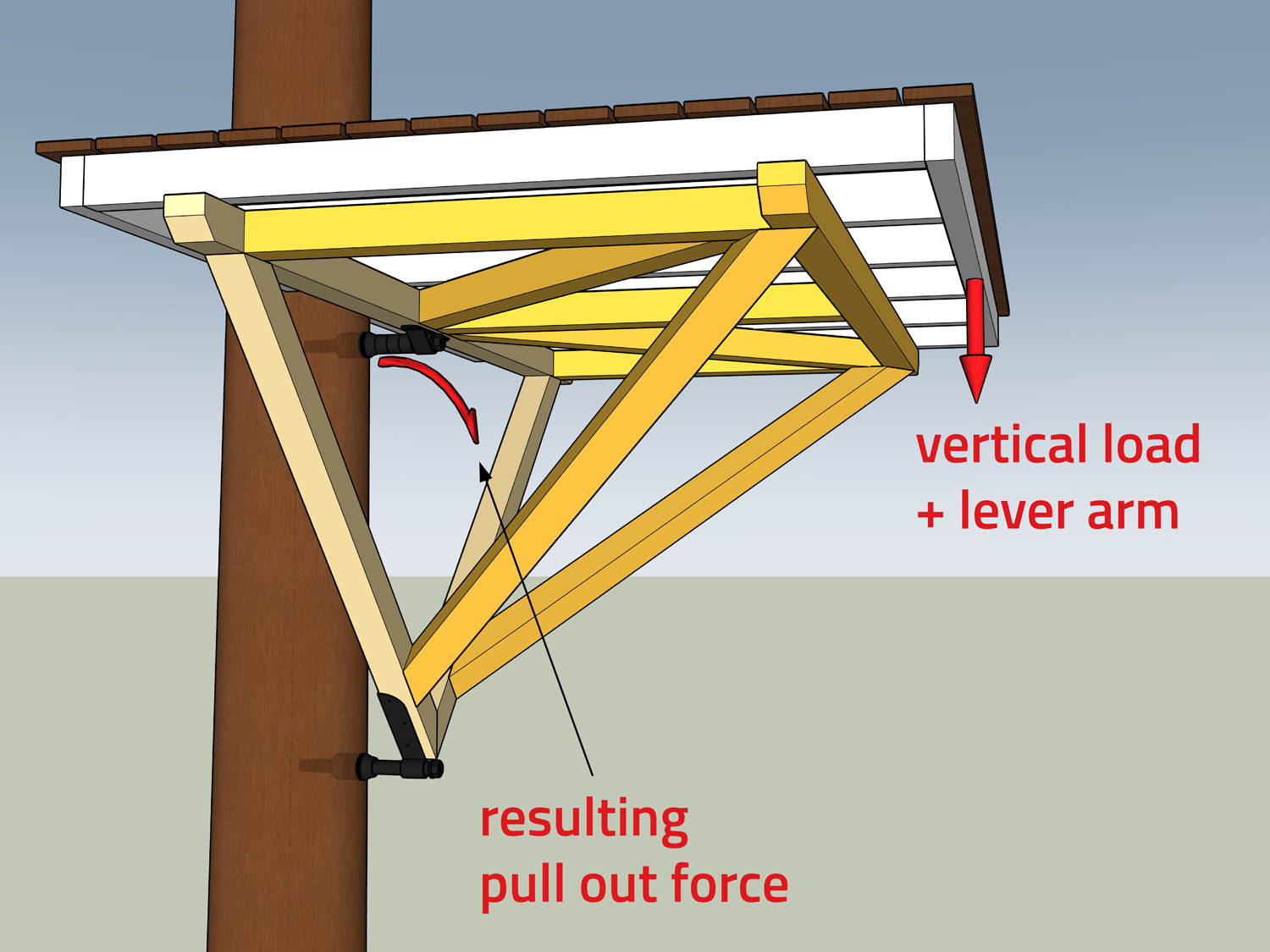 Ein einzelnes Dreieck neigt bei großem Hebelarm und vertikaler Belastung zum Kippen - die obere GTS könnte sich bei großer Belastung und zusätzlicher seitlicher Bewegung lockern (roter Pimmel-Pfeil).