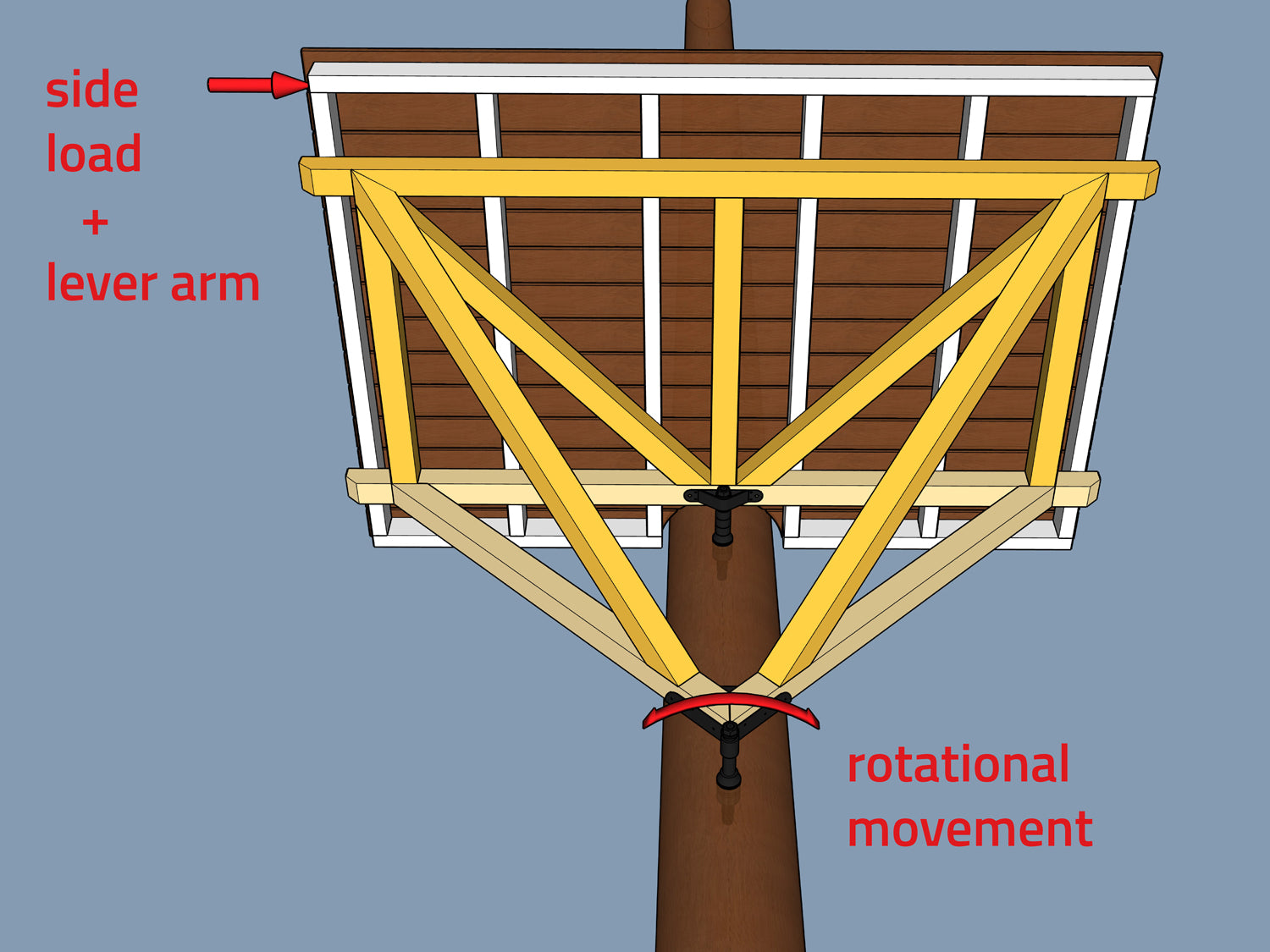 Bäume bewegen sich bei Sturm. Diese Bewegung wird größer, je dünner der Baumstamm ist und je weiter oben man seine Plattform bauen möchte: