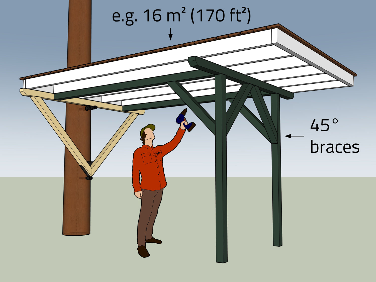 ❌ B: Für ein schweres Baumhaus wären die Streben zu dünn und zu lang (?) - hier müsste man noch zusätzliche Streben einziehen, um die Knicklänge zu verringern.