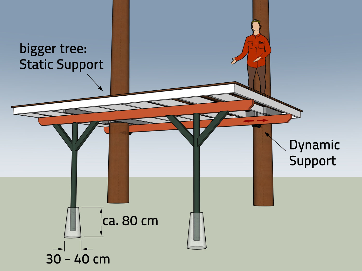 Auch bei zwei Bäumen kann der Grundriss durch die Stelzen beliebig erweitert und ausgerichtet werden. Wichtig ist, dass bei großer Baumbewegung einer der Bäume entkoppelt wird. Die Stützen müssen mit kurzen Streben (dunkelgrün) ausgesteift werden. Ansonsten werden kleine Bewegungen der Bäume von der Konstruktion gut abgepuffert.