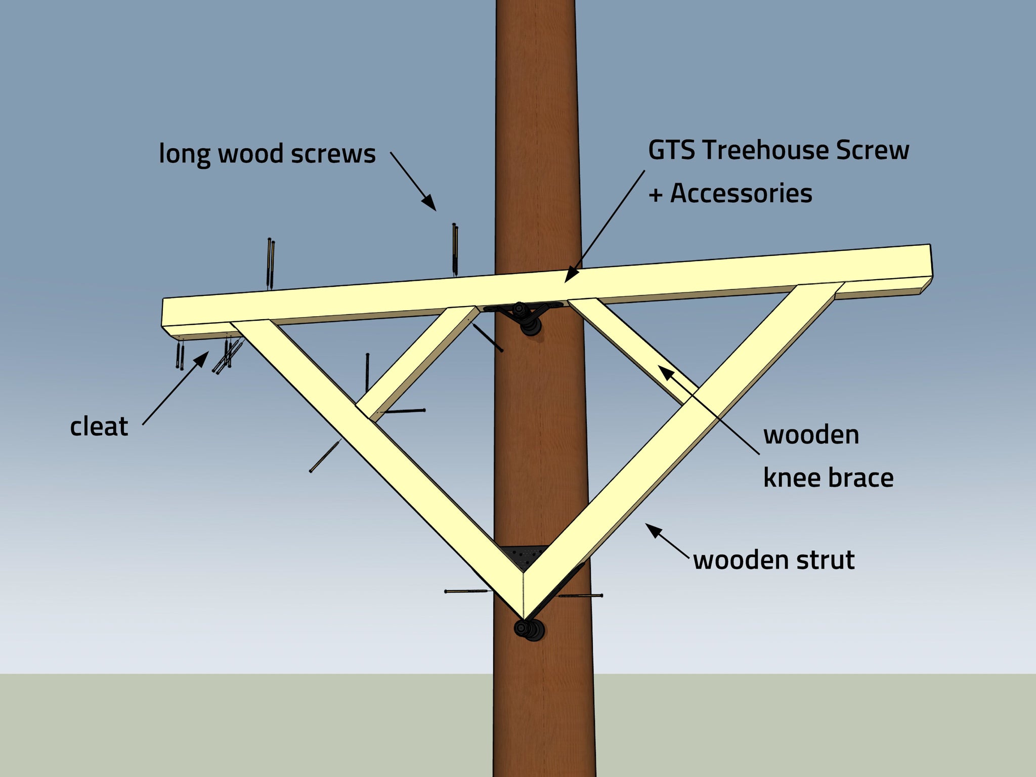 Hier sieht man gut, wie man mit einem Dreieck die Spannweite vergrößern kann. Die darauf befestigten Plattformbalken haben dadurch eine wesentlich breitere Auflage und die Plattform wird stabiler.